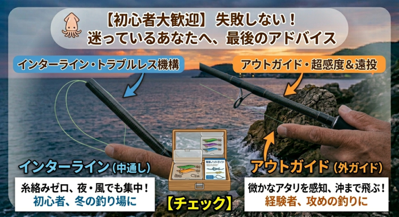 初心者の方はもちろん、ベテランでも「強風下のエギング釣行」が多いなら、インターライン一択です。トラブルでイライラする時間がなくなるだけで、釣果は確実に伸びます。